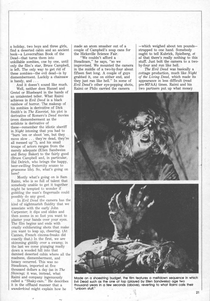 Cuando conocí a Sam Raimi en el Festival de Cine de Cannes en mayo de 1982, mi primer pensamiento fue que este tipo era una de tres cosas: un ayudante de camarero, un estudiante de secundaria estadounidense fugitivo o un genio. No era un ayudante de camarero, y Raimi terminó la secundaria hace tiempo, aunque tiene ese aspecto atemporal de estudiante de segundo año que hará que los camareros le pidan su carnet de conducir o su tarjeta de alcohol hasta que tenga al menos treinta y cinco años. Que sea un genio aún no se ha demostrado; que ha hecho la película de terror más ferozmente original de 1982 es indudable. El único problema es que puede que nunca la veas.