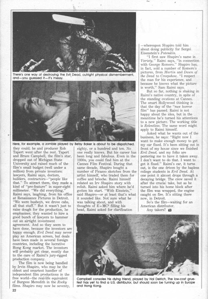 “Vi por primera vez el nombre de Shapiro en ‘Variety’, dice Raimi, “mencionado en relación con George Romero”. De hecho, Shapiro ha vendido varias películas de Romero, desde “Martin” y “Night of the Living Dead” hasta “Creepshow”. “Respeto a este hombre por su experiencia y porque sabe lo que vale la película”, agrega Raimi.